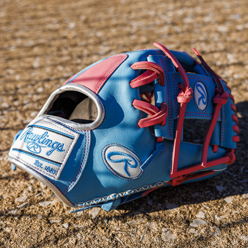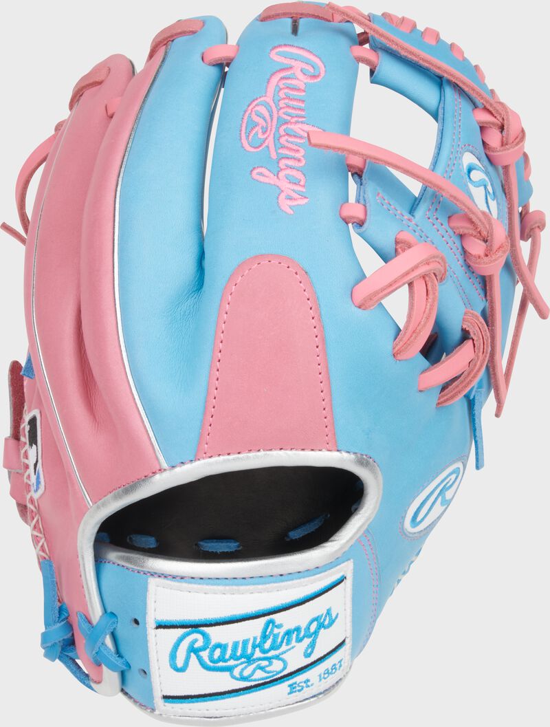 Stand out on the field with this exclusive 11.5-inch Rawlings R2G Heart of the Hide pink and Columbia blue infield glove!